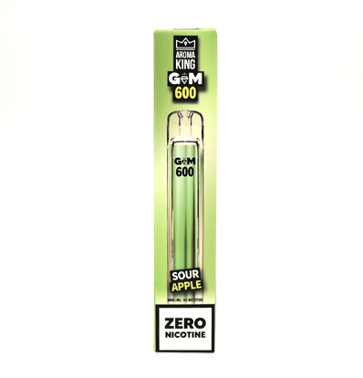 Aroma King Gem 600 Sour Apple disposable vape pod is a single piece unit. It is fully charged straight out of the box and providing a high-capacity 600 Puffs. There is no button, simply attach the filter, inhale and enjoy rich full flavored vape.