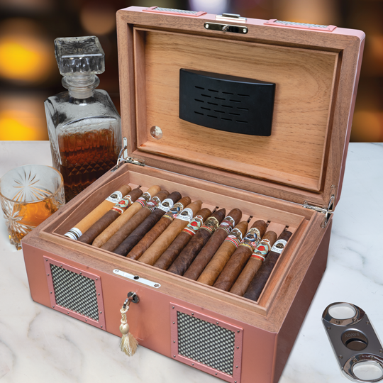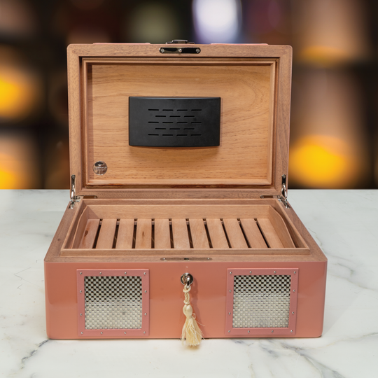 Ashton Humidors are crafted in Ireland from the finest materials in the world. The interior is made from premium Spanish cedar hardwoods assembled with interlocking joints and heavy-duty hinges to guarantee a flawless seal every time the lid is shut. Each box comes with a vented, removable cedar tray, a traditional humidification device, and a lock with a key. Age your cigar for years in an exclusive box crafted to the highest standards for performance and looks. Order one of our last humidors in a Retro 1950s Metallic Pink finish for a big discount before they’re gone. Inventory is very limited.