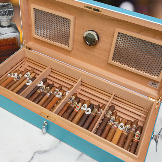 The Brizard Positano Airflow Humidor is an opulent box crafted from a solid Spanish interior finished in turquoise Italian leather with an exotic sapele wood grain on the top and chrome hardware. Brizard & Co.’s unique airflow system elevates your cigars from the floor of the box to ensure air and moisture circulate freely around your cigars. The Positano is equipped with Boveda humidification packs that fit inside aluminum screens magnetically mounted on the inside of the lid on each side of the digital hygrometer. Adjustable cedar dividers make it easy to organize your cigars according to brands, blends, or sizes. And heavy-duty hinges facilitate a firm seal when you’re opening and closing the lid. Order the Positano Airflow Humidor from Brizard & Co. for a colorful and impressive box that looks cool and promises to age your cigars beautifully.