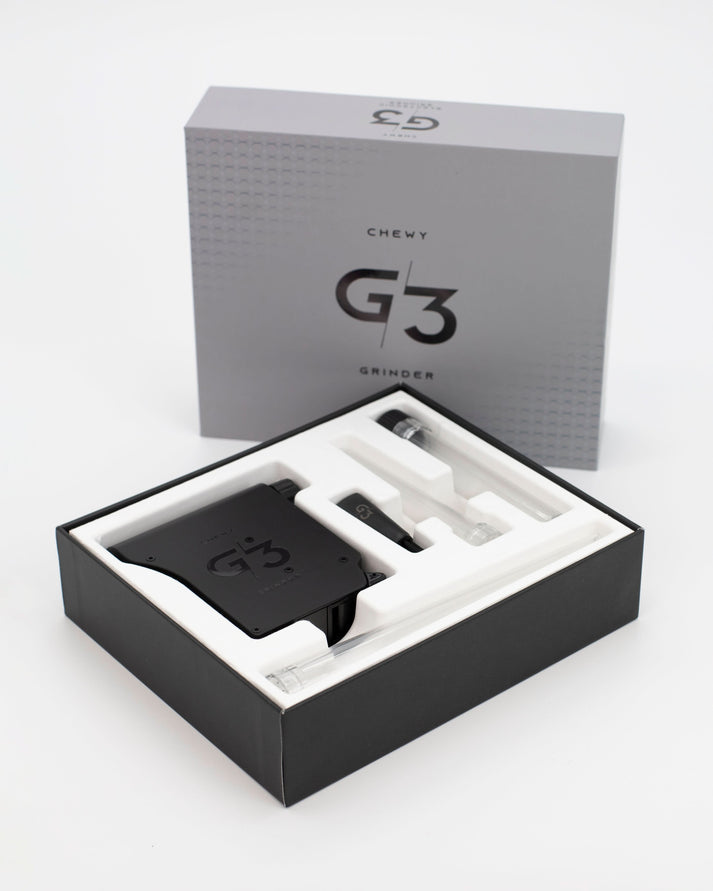 The Chewy G3 Portable Electronic Grinder is for herb preparation. With its patented trigger-loading technology, it stores and grinds up to 5 grams of dry herb effortlessly. Five stainless steel uni-directional blades ensure a consistent grind, while the rechargeable 9V lithium battery delivers hundreds of grinds on a single charge. Built with a sleek, non-stick design, the Chewy G3 is easy to clean and perfect for on-the-go use. Compact and efficient, it’s the ultimate tool for herb enthusiasts seeking convenience and precision.