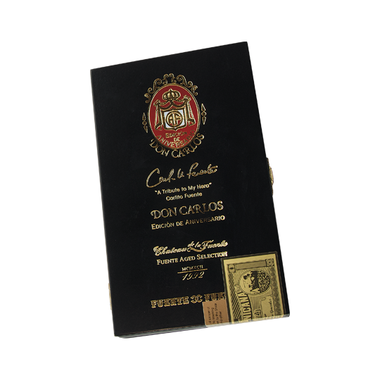 Experience each classic format available in the ultra-rare and prized Don Carlos Edicion de Aniversario blend in an awesome 5-cigar collection. Blended to commemorate the 30th anniversary of the world-renowned Don Carlos line from the Fuente family, this stunning selection is handcrafted from an extremely rare Sun Grown Dominican wrapper over an aged combination of the finest Dominican binder and filler tobaccos. Each format presents a marvelous medium-bodied profile of coffee, cedar, almonds and figs with distinct nuances. Perfect construction and an unparalleled finish make this rare assortment an ultimately luxurious statement, whether you’re looking for an impressive gift for your favorite cigar lover, or you’re searching for an extraordinary acquisition to your very own collection.