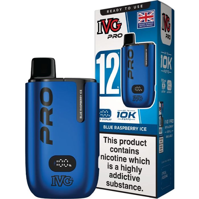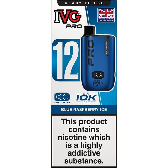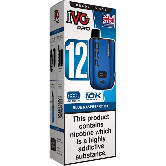 The IVG Pro 12 pod vape kit features a built-in 1000mAh rechargeable battery and is capable of producing up to 10,000 puffs before the 2ml prefilled integrated pod and 10ml refill need to be replaced.