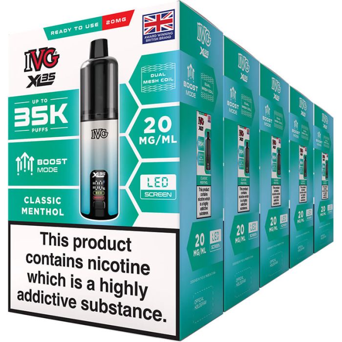 Five pack of IVG XL35 pod vape kits. Capable of producing up to 35,000 puffs each.