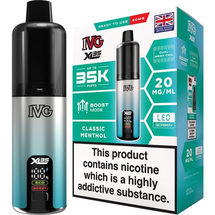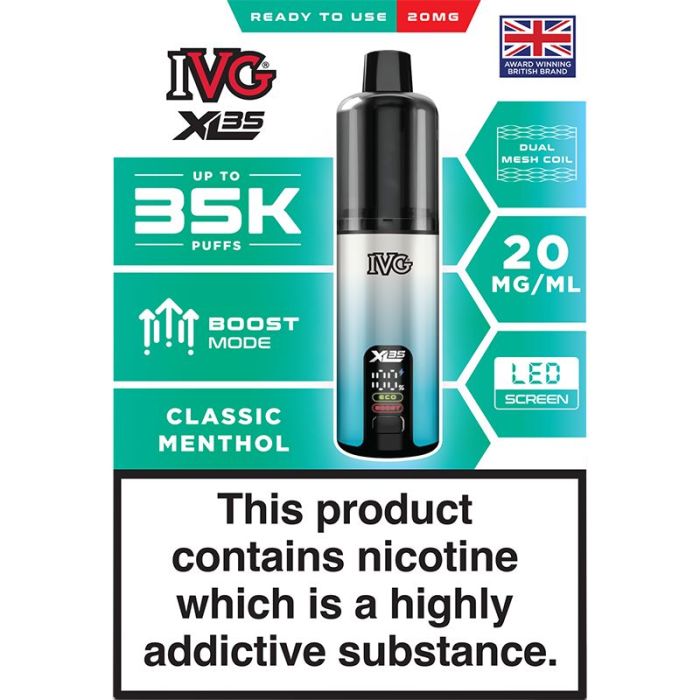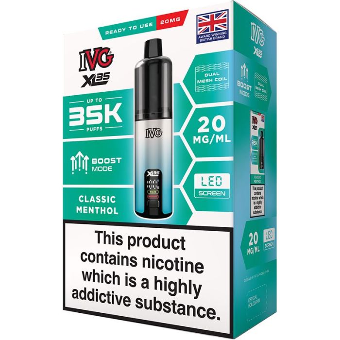 Each kit comes with a 2ml pod & two 10ml refills in a 20 mg/ml nicotine strength which can be switched between at any time. Additional IVG XL35 pod & refills are available to purchase separately.