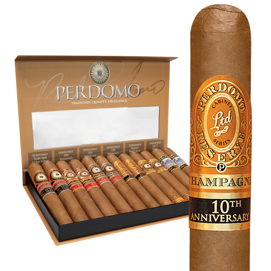 The 12-cigar Perdomo Connecticut Connoisseur Collection is loaded with creamy and nutty gems drafted from the finest tobaccos grown on Nick Perdomo’s extensive Nicaraguan estates. Six unique blends are finished in an elegant, golden-blond Ecuador Connecticut wrapper leaf blended to bring out delicate nuances of flavor and aroma. Bestselling classics like Perdomo 10th Anniversary Champagne, 20th Anniversary Connecticut, and Double Aged Vintage are included with the all-new Perdomo 30th Anniversary Connecticut, plus the Lot 23 Connecticut, and Habano Connecticut blends. Distinctive tasting notes of cedar, white pepper, almond, cashew, coffee bean, nougat, and more emerge in the perfect Perdomo sampler for fans of Connecticut-seed wrappers. Indulge in an impressive Perdomo sampler today.