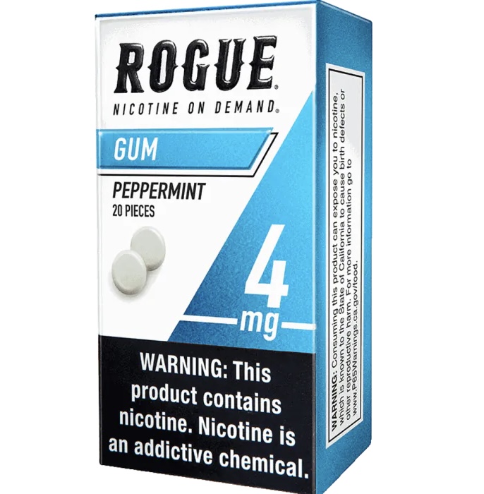 Rogue Peppermint 4mg nicotine gum is tobacco leaf-free and delivers the taste of peppermint. This sugar-free, stain-free, and spit-free nicotine gum serves as an alternative to traditional smokeless tobacco products. Each pack includes 20 pieces, with a nicotine strength of 4mg per piece. Each piece provides up to 30 minutes of flavor release and comes in a compact package that can be taken anywhere.
