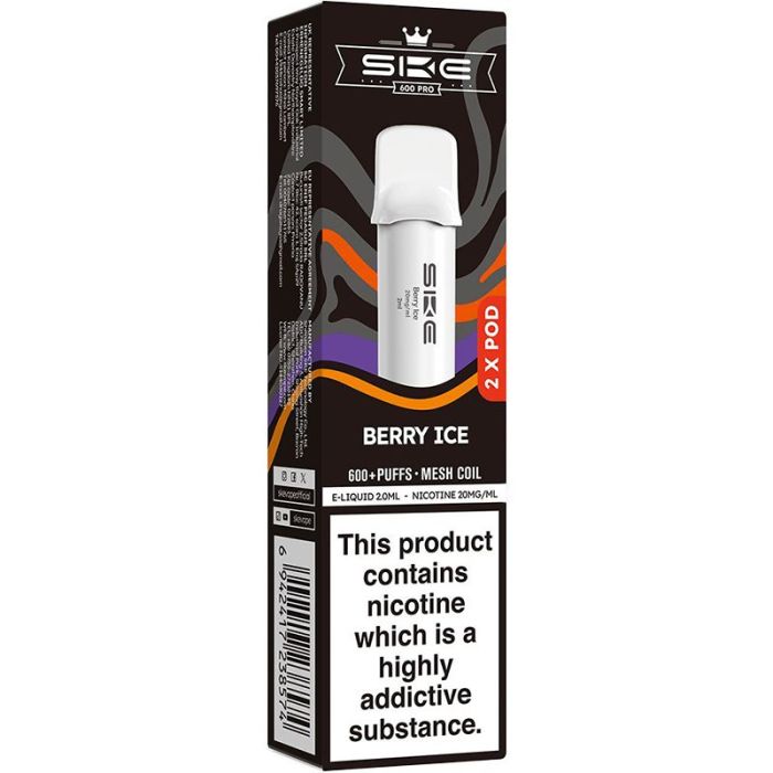 The SKE Crystal Pro 600 pods provide two prefilled pods, with each containing 2ml of 20 mg/ml nicotine salt e-liquid and providing approximately 600 puffs each. These pods are compatible with the SKE Crystal Pro 600 pod vape kit.